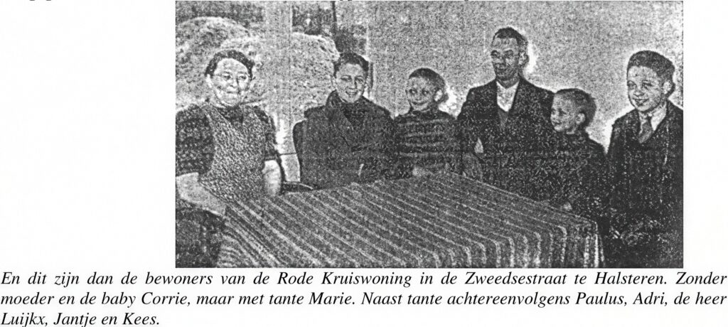 Na een jaar zit de familie Luijkx voor het eerst weer „op zijn eigen”. Niet dat ze het in Bergen op Zoom in de Vlierstraat 20 bij de heer Tello niet naar hun zin hebben gehad, maar een vrije woning is toch maar alles. Jammer dat moeder en de baby er niet bij zijn geweest toen vader Luijkx met zijn vier ferme jongens Woensdag de hun aan de Zweedsestraat te Halsteren (Vogelenzang) toegewezen Zweedse woning betrokken.