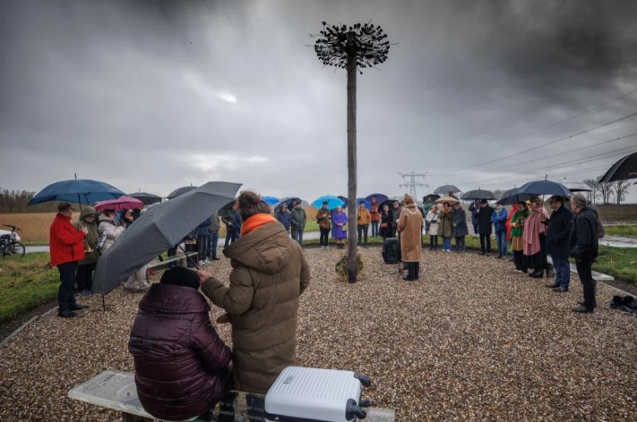 HALSTEREN – In de kletsende regen verzamelden zich zaterdagmiddag tientallen inwoners in de Auvergnepolder voor de jaarlijkse herdenking van de Watersnoodramp van 1953. Bij het monument Signalen in het landschap werd stilgestaan bij de 78 slachtoffers uit Halsteren en Lepelstraat. De plechtigheid was sober, maar de verhalen en herinneringen maakten diepe indruk.